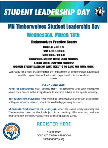 Registration is now open for the 2026 Timberwolves Leadership Day on March 18, held on the practice court at the Minnesota Timberwolves practice facility. Students will participate in a keynote, panel discussion, and interactive activities before attending the 7:00 pm game against the Utah Jazz. This year, registration also includes Jimmy John’s for dinner. Tickets are limited, so we encourage you to register soon.