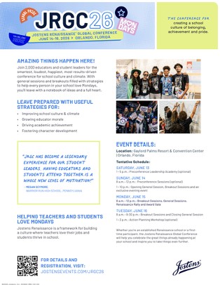 We have another incredible opportunity for students and advisors to attend a global conference this summer. If you loved the Jostens Renaissance Regional Fight Forward event that took place in February, this will blow your mind! For more information about the Jostens Renaissance Global Conference, you can learn more here. https://www.jostensevents.com/ event/JRGC26/home